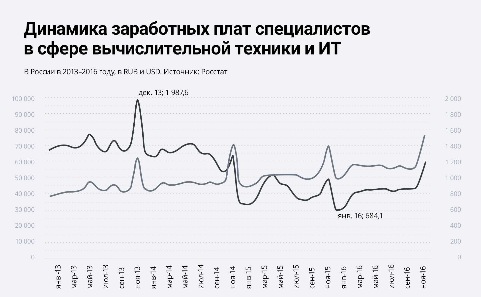 Динамика заработных плат специалистов в сфере вычислительной техники и ИТ в России в 2013–2016 году