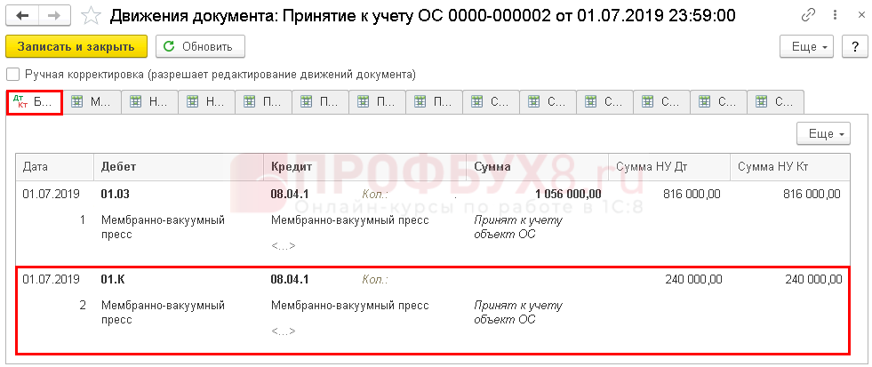 Разница между стоимостью в БУ и НУ отразится по Дт 01.К: это та часть стоимости, которая не амортизируется в НУ.