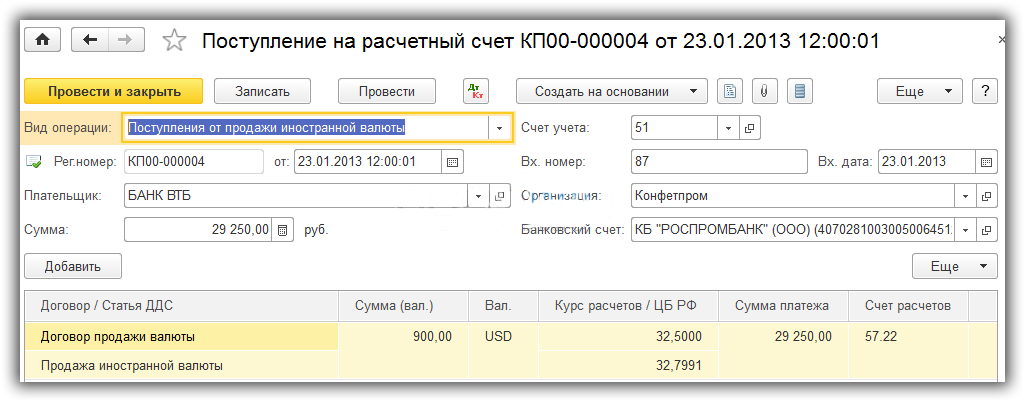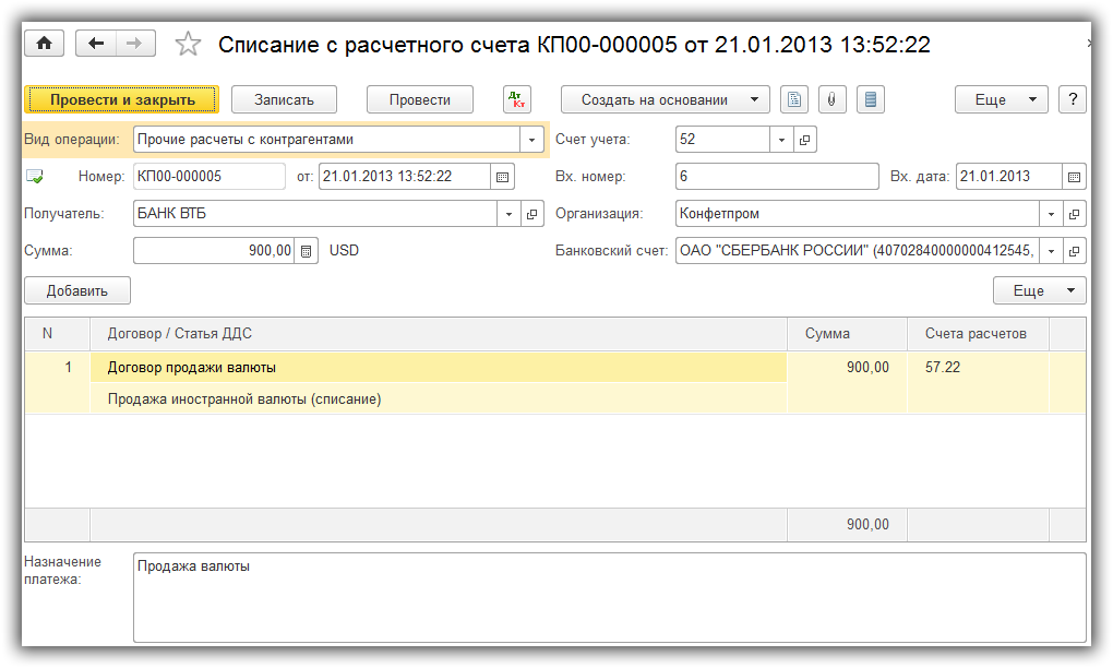 При заполнении документа следует обратить внимание на поля «Вид операции» — «Прочие расчеты с контрагентом» и поле «Счет расчетов» в табличной части — в него мы подставим счет 57.22 (Реализация иностранной валюты). Всё, денежные средства мы отправили банку