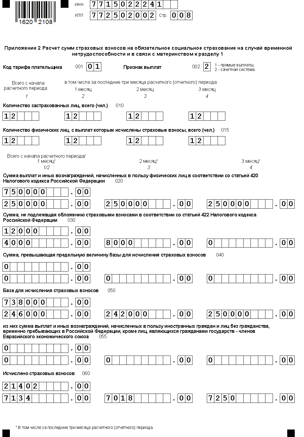 - Всего за квартал : 750000 р., в том числе не облагаемые страхвзносами — 12000 р.