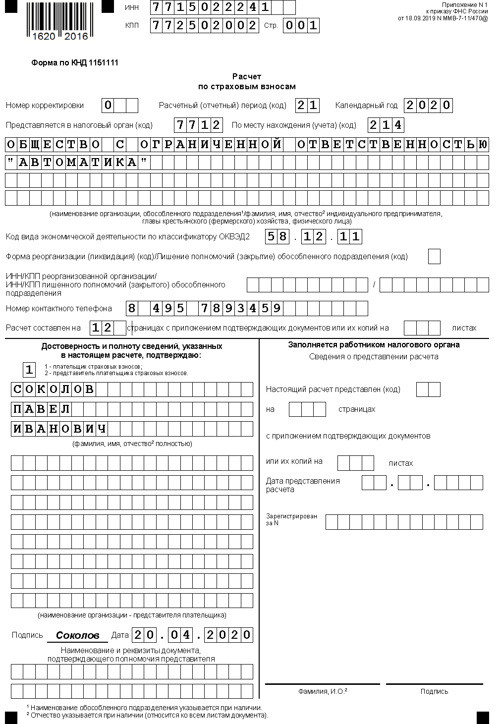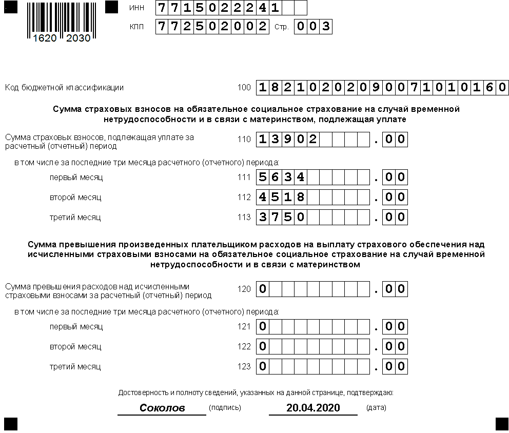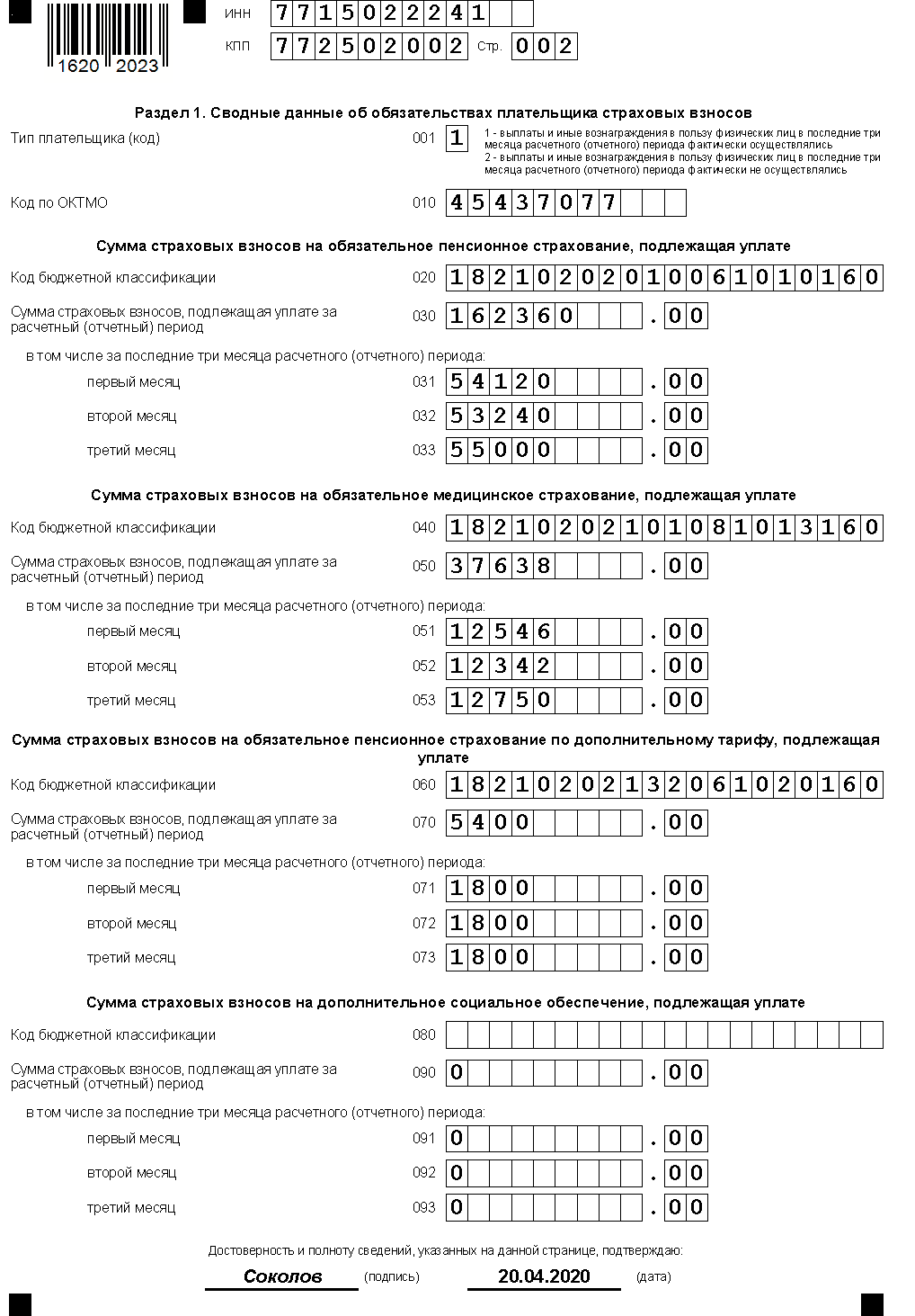 - Образец заполнения расчета по страховым взносам за 1 квартал 2020 года