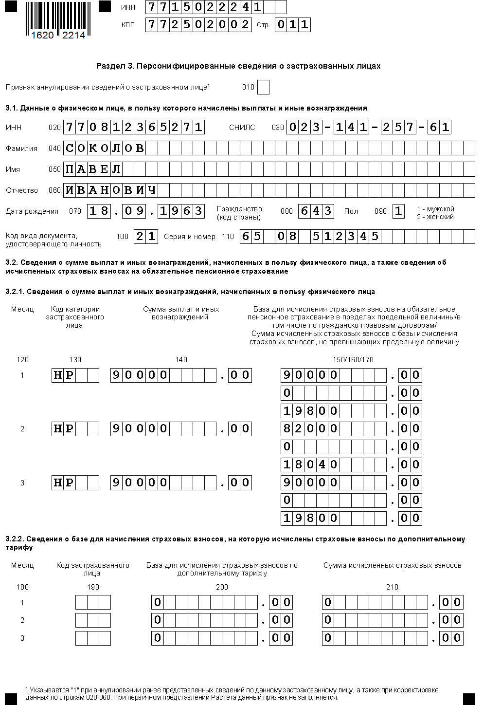 Раздел 3 нужно заполнить в отношении каждого застрахованного лица. В подразделе 3.1 указываются личные данные: ИНН, СНИЛС, фамилия, имя и отчество, дата рождения, код страны гражданства (РФ – 643), пол, код документа (приложение № 6 к Порядку), его серия и номер.