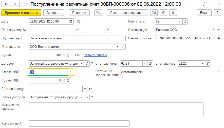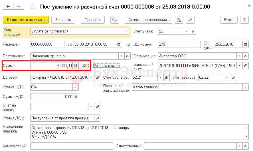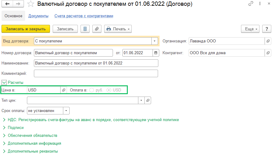 Договор – договор с плательщиком с видом договора С покупателем (при расчетах в валюте укажите валюту в договоре во вкладке Расчеты)