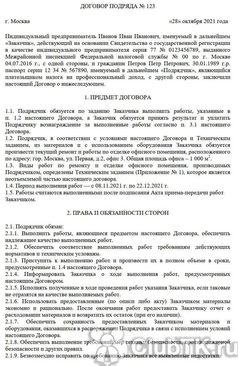 Еще один пример договора с самозанятым — договор подряда: