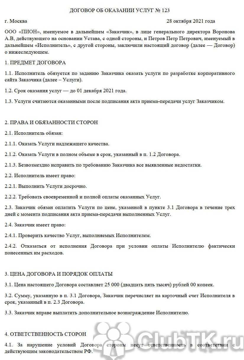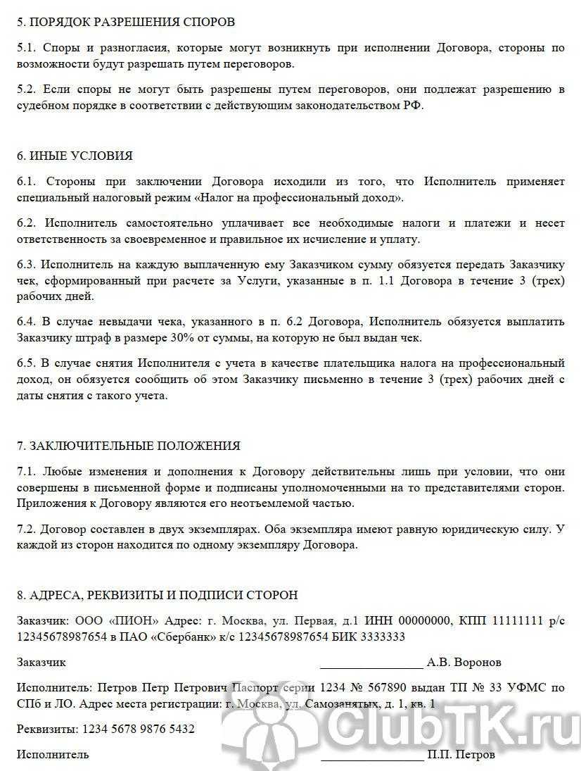 Вот пример — образец договора с самозанятым на оказание услуг 2022 года, составленного по всем правилам: