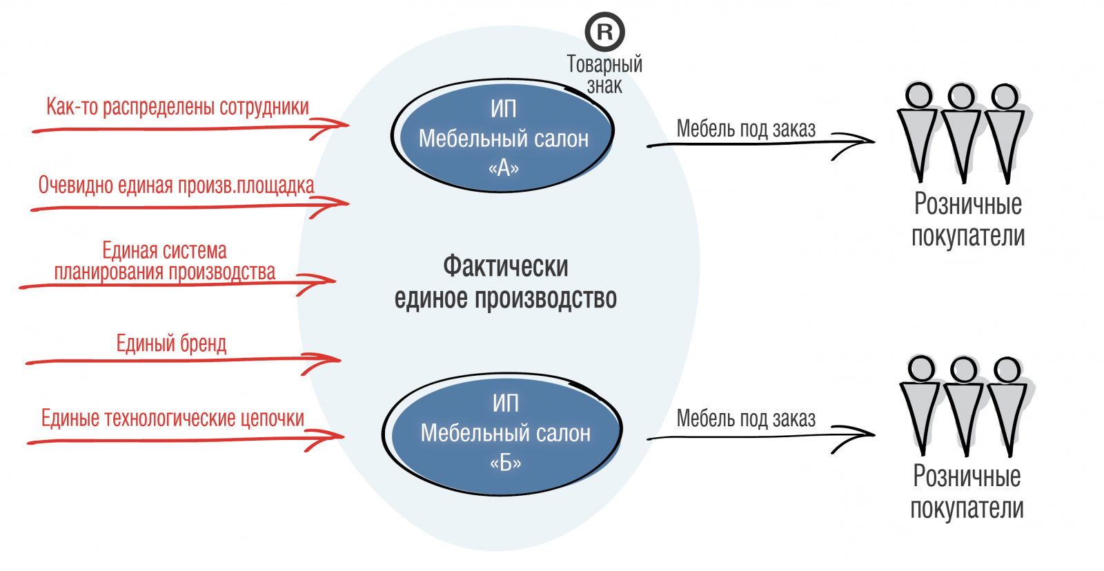 Две производственные компании занимались одинаковым видом деятельности — производство мебели (кухонь) по индивидуальным заказам. Не обошлось без случайных совпадений: цех и производственное оборудование оказались общим; единый процесс размещения и контроля выполнения каждого заказа без указания производителя; сотрудники каждой компании работали «рука об руку» друг с другом над каждым заказом; невозможность выделения материалов, направленных на изготовление конкретной продукции.