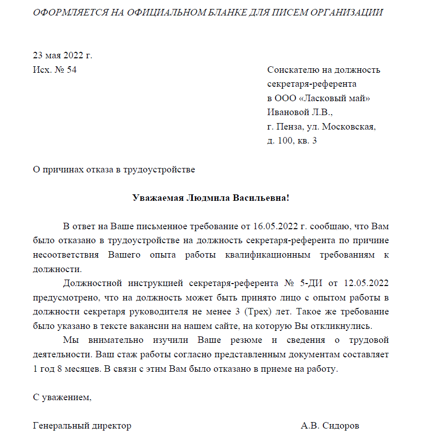 Как составить письменный отказ в приёме сотрудника на работу