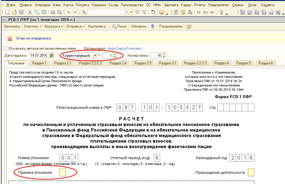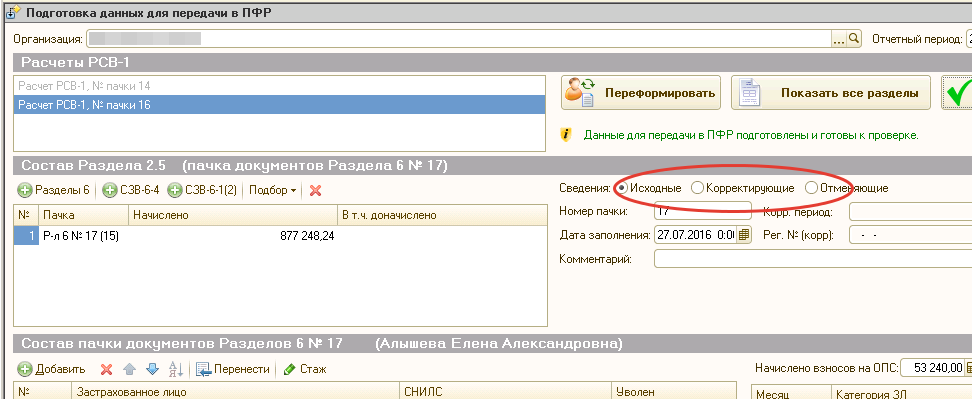 Для создания уточняющей формы РСВ-1 необходимо открыть Меню / Кадры / Подготовка данных ПФР, выбрать нужный период. Вы увидите отправленный отчет.