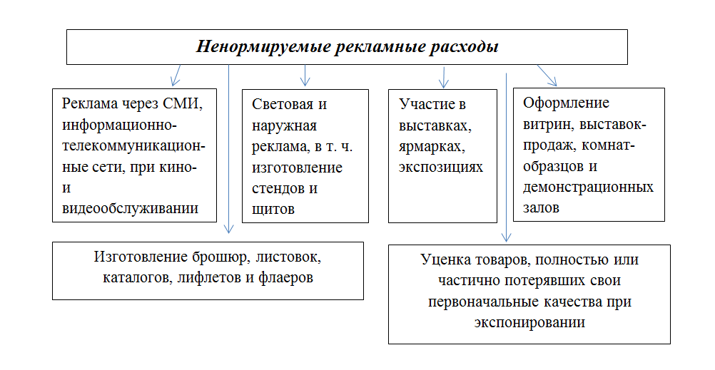 Расходы на рекламу — это расходы на разработку и издание рекламных изделий (иллюстрированных прейскурантов, каталогов, брошюр, альбомов, проспектов, плакатов, афиш, рекламных писем, открыток и т.п.); разработку и изготовление эскизов этикеток, образцов оригинальных и фирменных пакетов, упаковки и т.д.; на рекламные мероприятия (объявления в печати, передача по радио и телевидению); световую и иную наружную рекламу; на изготовление стендов, муляжей, рекламных щитов, указателей и др.; хранение и экспедирование рекламных материалов; на оформление витрин, выставок-продаж, выставок и ярмарок, комнат образцов; уценку товаров, полностью или частично потерявших свое первоначальное качество при экспонировании в витринах; проведение иных рекламных мероприятий.