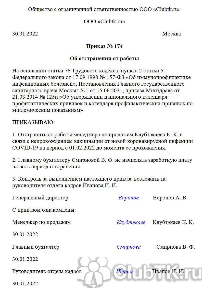 2. Приказ об отстранении можно издать, если соблюдены все необходимые условия. Начало срока отстранения следует сверить с постановлением Главного санитарного врача своего региона (дата, до которой работники должны вакцинироваться вторым компонентом). Срок окончания отстранения должен быть четко фиксируемым.