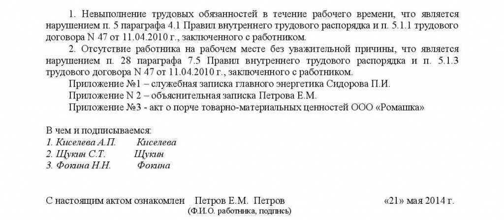 В ней указывается точно и подробно суть нарушения, свидетели, если есть, время и дата, место. Подписывается составляющими, виновным и третьими лицами, если они присутствовали на месте. Отказ от подписи в акте виновного на его легитимность не влияет. Акт фиксируется в соответствующем кадровом журнале.