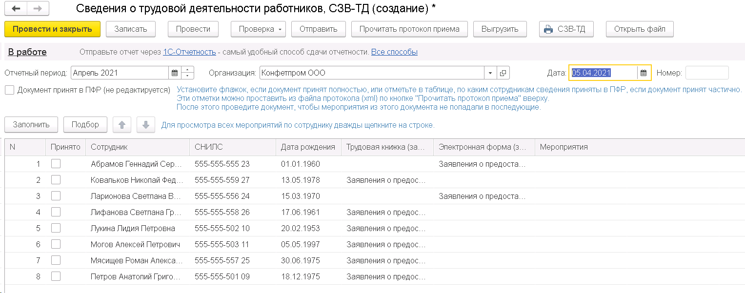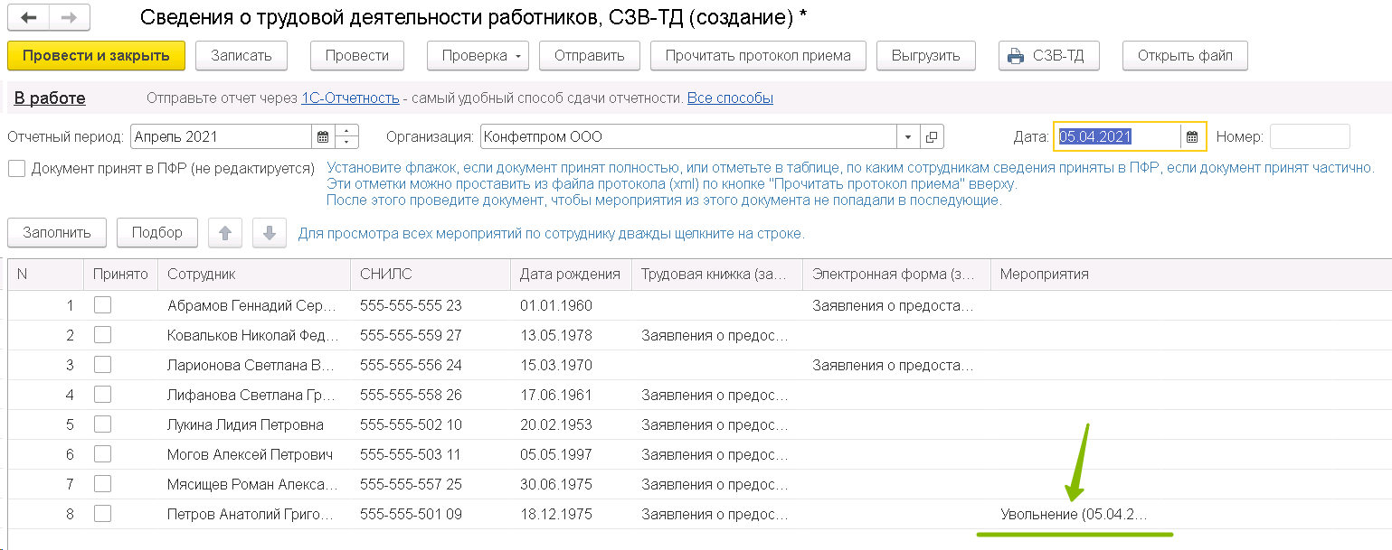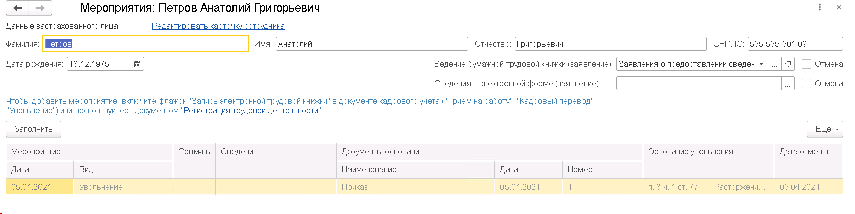 - 1. В СЗВ-ТД по сотруднику подтягиваются мероприятия из уже сданных отчетов