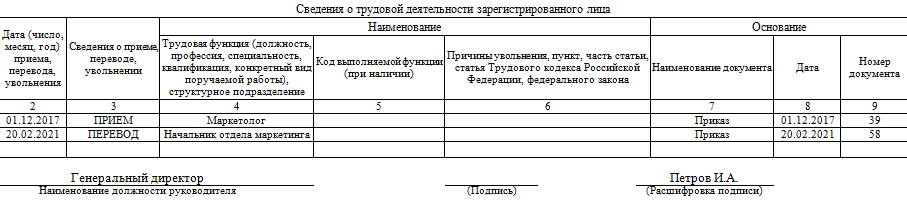 Пример. Иванов Петр Семенович принят на должность маркетолога в ООО «Прометей» 1 декабря 2017 года. 20 февраля 2021 года он переведен на должность начальника отдела маркетинга. Отчетная форма СЗВ-ТД за февраль будет выглядеть так: