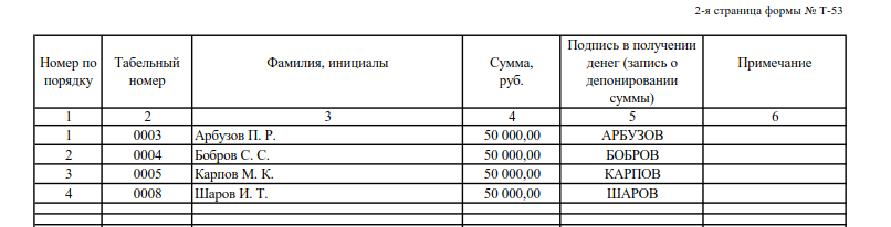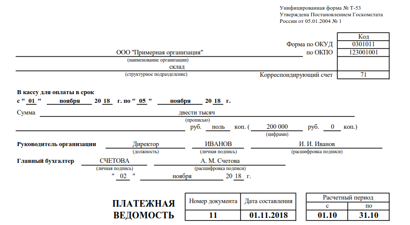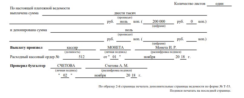 Таковым в этом случае является расходный кассовый ордер. Заполненная ведомость передается для проверки в отдел бухгалтерии. При отсутствии ошибок руководитель организации оставляет в платежной форме Т-53 свою подпись.
