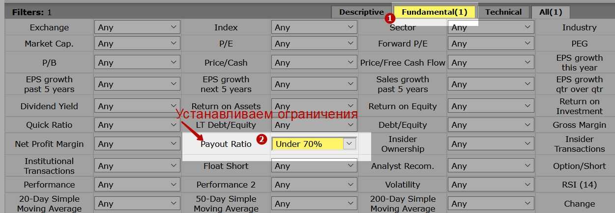 Для того чтобы найти компании с оптимальным размером дивидендных выплат можно воспользоваться сервисом Finviz. Во кладке “Fundamental” находим опцию “Payout Ratio” у которой устанавливаем пороговое значение меньше 70%.