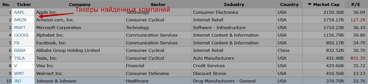 В результате было найдено более 1800 компаний, 10-ка первых из них по размеру капитализации на рисунке ниже.