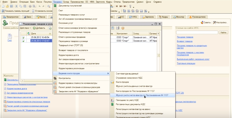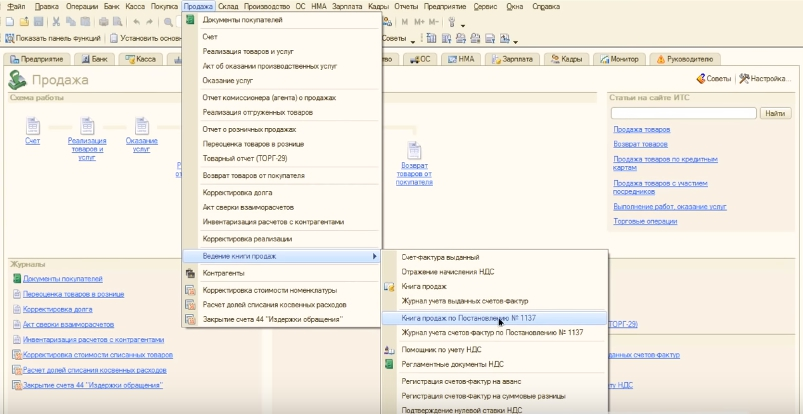 Также можно открыть «Книгу продаж» из раздела «Продажи». Она также выбирается из выпадающего меню и содержит надпись о постановлении 1137.