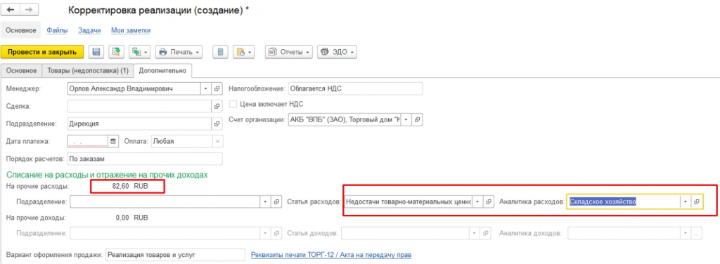 Этот вариант выбирается в ситуации, когда зафиксирована недопоставка товара. Операция осуществляется двумя видами корректировки: