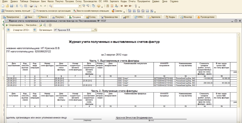 Когда КСФ сформируется в 1С его нужно зарегистрировать в журнал учета и в книге покупок. Для этого во вкладке «Продажа» нажать на «Ведение книги продаж». В выпавшем окне выбрать «Журнал учета счетов-фактур по Постановлению №1137».