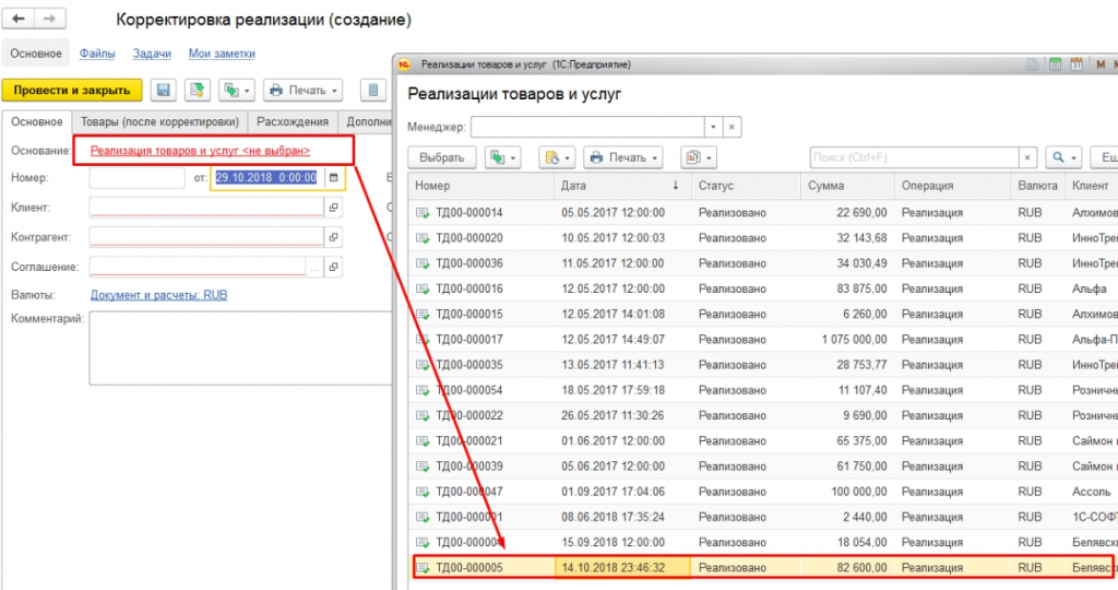 Нажать на поле «Основание». В открывшемся окне со списком реализаций выбрать нужное наименование. Программа сама заполнит необходимые данные в табличной части автоматически.