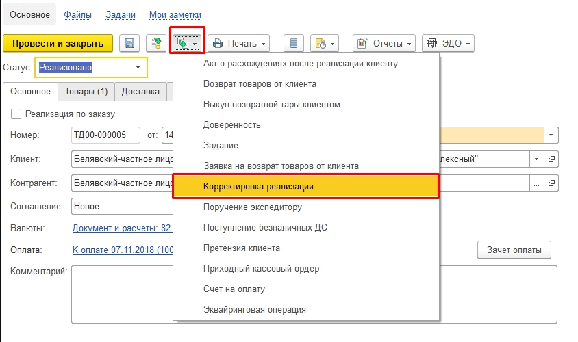 Клик «Ввести на основании» и в выпадающем окне выбрать «Корректировка реализации».