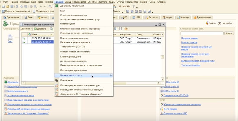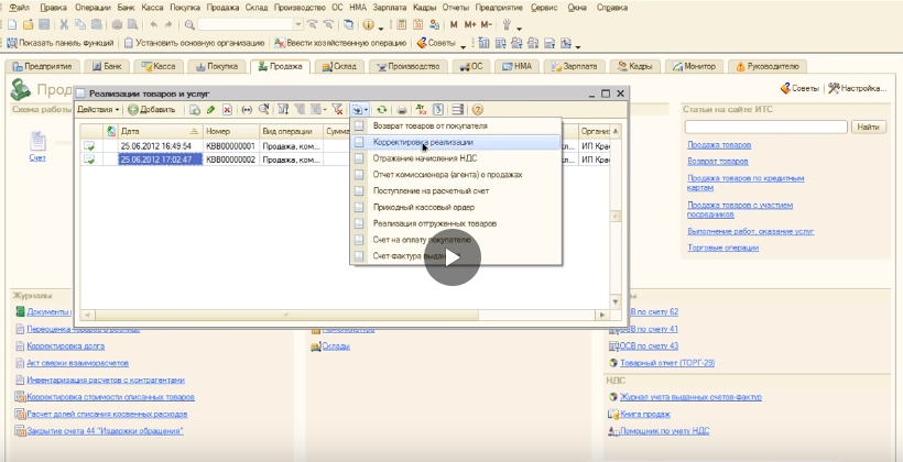 Для создания счета на уменьшение нужно перейти во вкладку «Продажа». Затем в «Реализация товаров» и выбрать документ, на основании которого будет проведена КСФ.