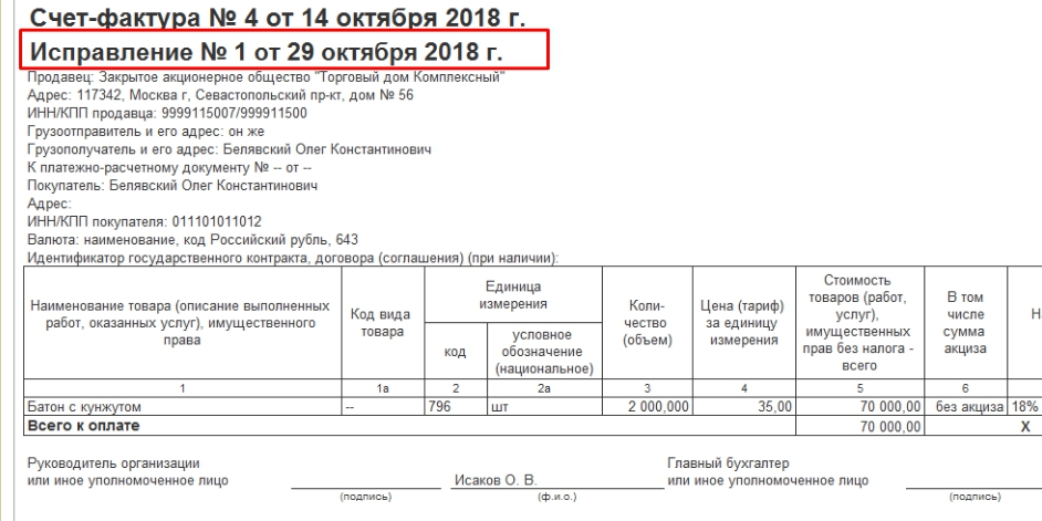 Исправленный счет-фактура (ИСФ) — это новая версия (экземпляр) первоначального документа (п. 7 Правил заполнения счета-фактуры, утв. постановлением Правительства РФ N 1137). Он расценивается как новый самостоятельный документ, который может существовать без первоначального. В отличие от корректировочного счета-фактуры ИСФ присваивается номер и дата первичного счета-фактуры, а в строке «1а» указываются порядковый номер и дата исправления.