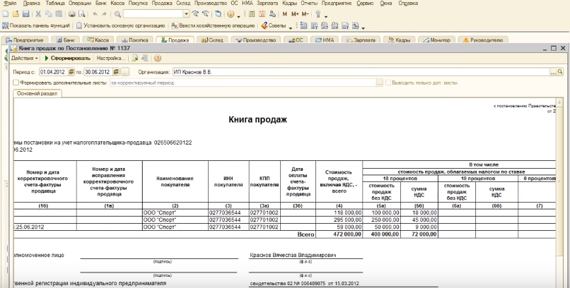После корректирования нужно провести регистрацию в «Книге продаж»,