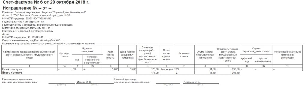 В данном примере — арифметическая ошибка, в общей стоимости не учтен НДС по невнимательности бухгалтера. Продавцу следует повторно выписать ИСФ за тем же номером, в котором заполняется строка 1а – указывается номер исправления, а в графе «стоимость товара» будет учтен НДС.