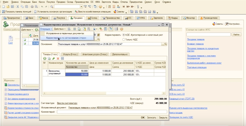 Откроется новое окно с документом, где вверху выбирается опция «операция», далее «Корректировка по согласованию сторон». Выполнится автоматическое заполнение необходимых полей и в графе «Основание» будет стоять тот документ, по которому была произведена первоначальная отгрузка или реализация.