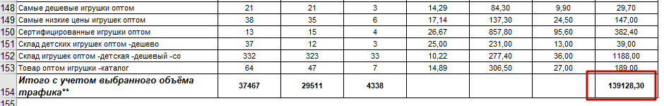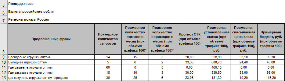 Давайте посчитаем примерный бюджет на все указанные типы рекламных кампаний в тематике оптовой продажи детских игрушек.