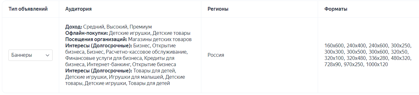 Выбрали пользователей с достатком выше среднего, которые совершают офлайн-покупки в категории «детские товары» и у которых долгосрочные интересы категории «Бизнес» плюс сужающие интересы категории «Товары для детей».