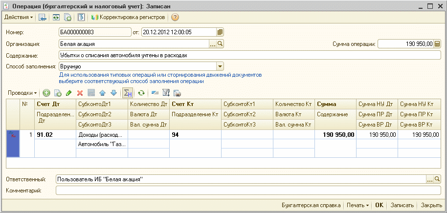 — 05.11.2012 — совершено хищение (угон) автомобиля; — 12.11.2012 получена копия постановления о возбуждении уголовного дела по факту хищения. В этот же день по результатам проведенной инвентаризации принято решение о списании автомобиля с учета. Остаточная стоимость автомобиля в бухгалтерском и налоговом учете с учетом амортизации за ноябрь 2012 года составляет 190 950,00 руб.; — 20.12.2012 — получена копия постановления о приостановлении уголовного дела по факту хищения и положительное решение страховой компании по выплате страхового возмещения. |