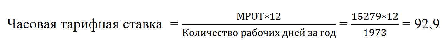 Рассчитать часовую тарифную ставку из МРОТ при 40-часовой рабочей неделе полагается по формуле: