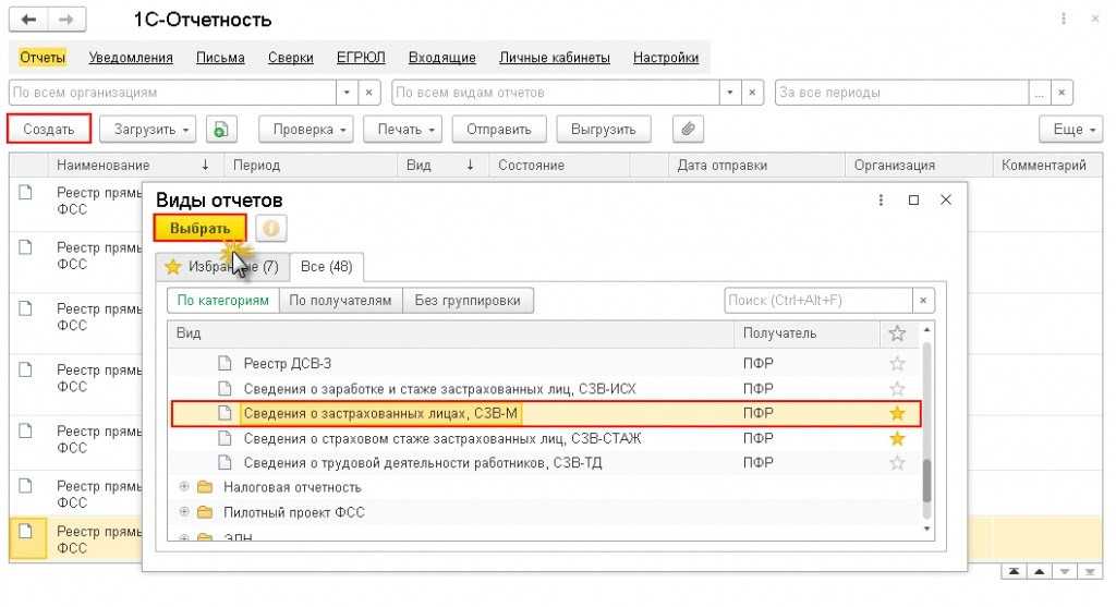 - выбрать в форме «Виды отчетов» отчет, называемый «Сведения о застрахованных лицах, СЗВ-М» в папке «Отчетность по физлицам».