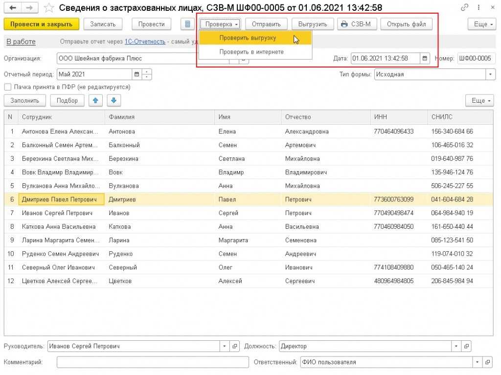 Кнопка «Открыть файл» позволяет просмотреть его содержимое. Специалисты рекомендуют сначала посмотреть информацию в файле, а затем уже отправлять его в ПФР. Проверить файл на соответствие требованиям Пенсионного фонда можно по кнопке «Проверка», выбрав затем «Проверить выгрузку». В данном случае 1С самостоятельно проверит файл на основании встроенного алгоритма.