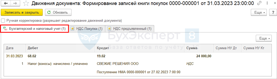 | 28 февраля | 68.02 | 19.02 | 24 000 | Принятие НДС к вычету | Формирование записей книги покупок | ||