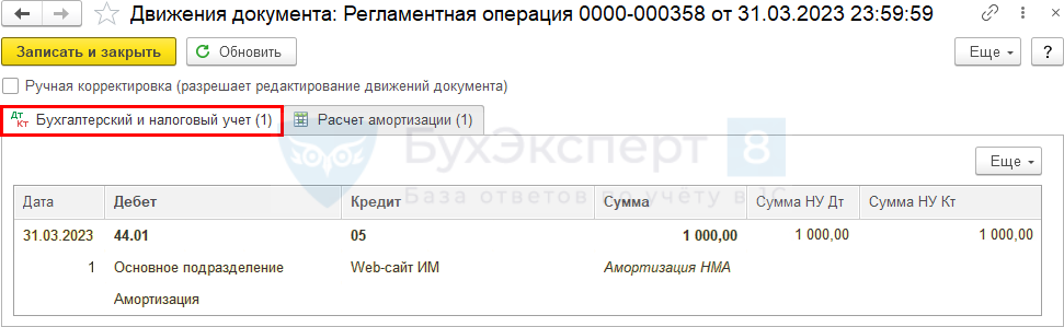 Аналогично осуществляется начисление амортизации за следующие месяцы до полного погашения стоимости. При выбытии НМА амортизация за последний месяц начисляется в документе выбытия, например, в документе Передача НМА.