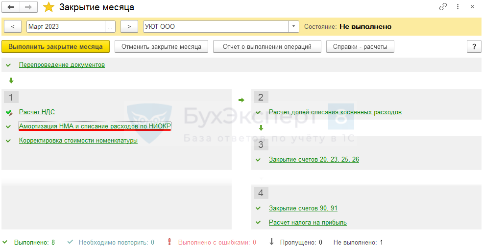 Ежемесячное начисление амортизации осуществляется при выполнении процедуры Закрытие месяца операция Амортизация НМА и списание расходов по НИОКР в разделе Операции —Закрытие месяца.