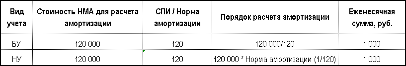 В нашем примере web-сайт принят к учету в качестве НМА и введен в эксплуатацию 28 февраля, следовательно, амортизация в БУ и НУ начисляется с марта.