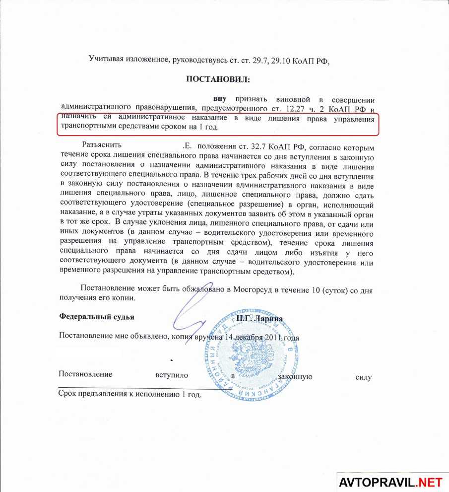 Назначается финансовая часть наказания судьей. Он же уполномочен лишить прав, и выполняет эту процедуру параллельно с наложением штрафа. Вследствие чего отсчёт срока уплаты штрафа за лишение водительских прав после вождения в нетрезвом виде начинается с того дня, когда постановление судьи вступит в законную силу.