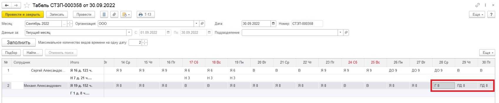 Заполнение табеля выглядит так. Нажмите на картинку, чтобы увеличить ее.