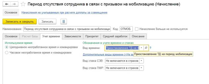 Вид начисления в программе заполните так: начисление назовите «Период отсутствия сотрудника в связи с призывом на мобилизацию», а вид времени — «Приостановление ТД на период мобилизации». Эти начисления необходимо заводить вручную.
