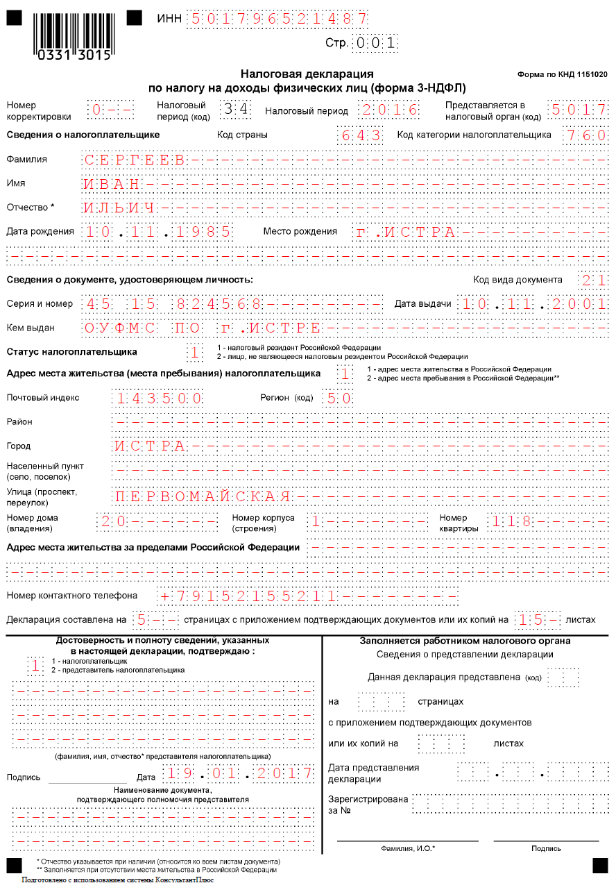 Так выглядит образец заполнения декларации по форме 3-НДФЛ