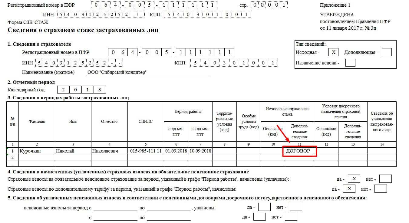 На основании этого отчета информация о стаже физического лица отразится на его лицевом счете в ПФР. Дополнительно нужно заполнить гр. 11. В ней прописывается: