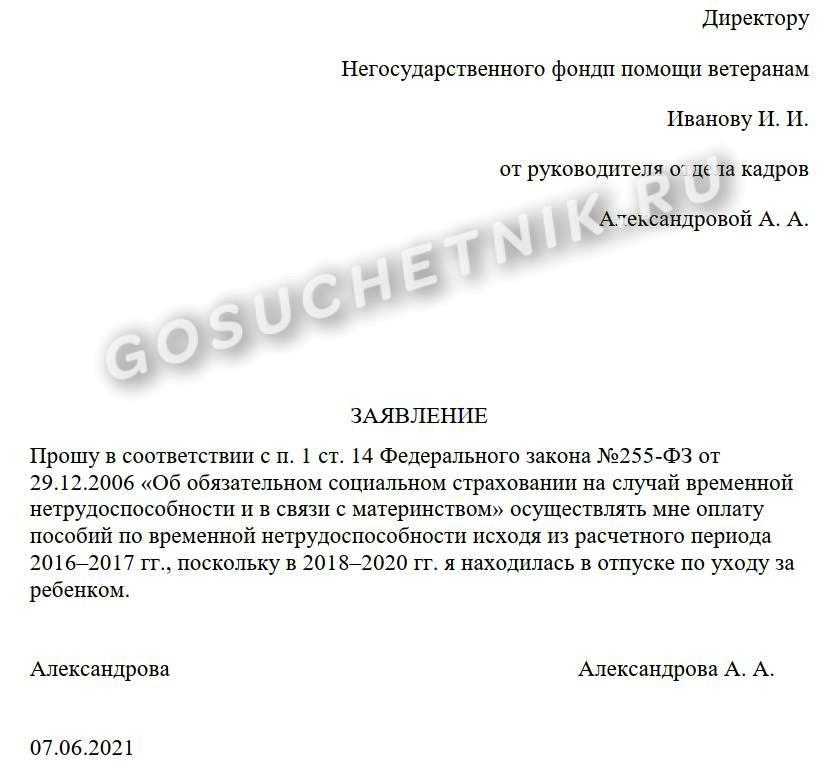 Директору ГБОУ ДОД СДЮСШОР «АЛЛЮР» Иванову И.И. от руководителя отдела кадров Александровой А.А. ЗАЯВЛЕНИЕ Прошу в соответствии с п. 1 ст. 14 Федерального закона №255-ФЗ от 29.12.2006 пересчитать пособие по больничному листу №645739208 с 21.05.2021 по 28.05.2021, исходя из расчетного периода 2016–2017, поскольку в 2018–2020 я была в отпуске по уходу за ребенком. Александрова Александрова А.А. 07.06.2021 |