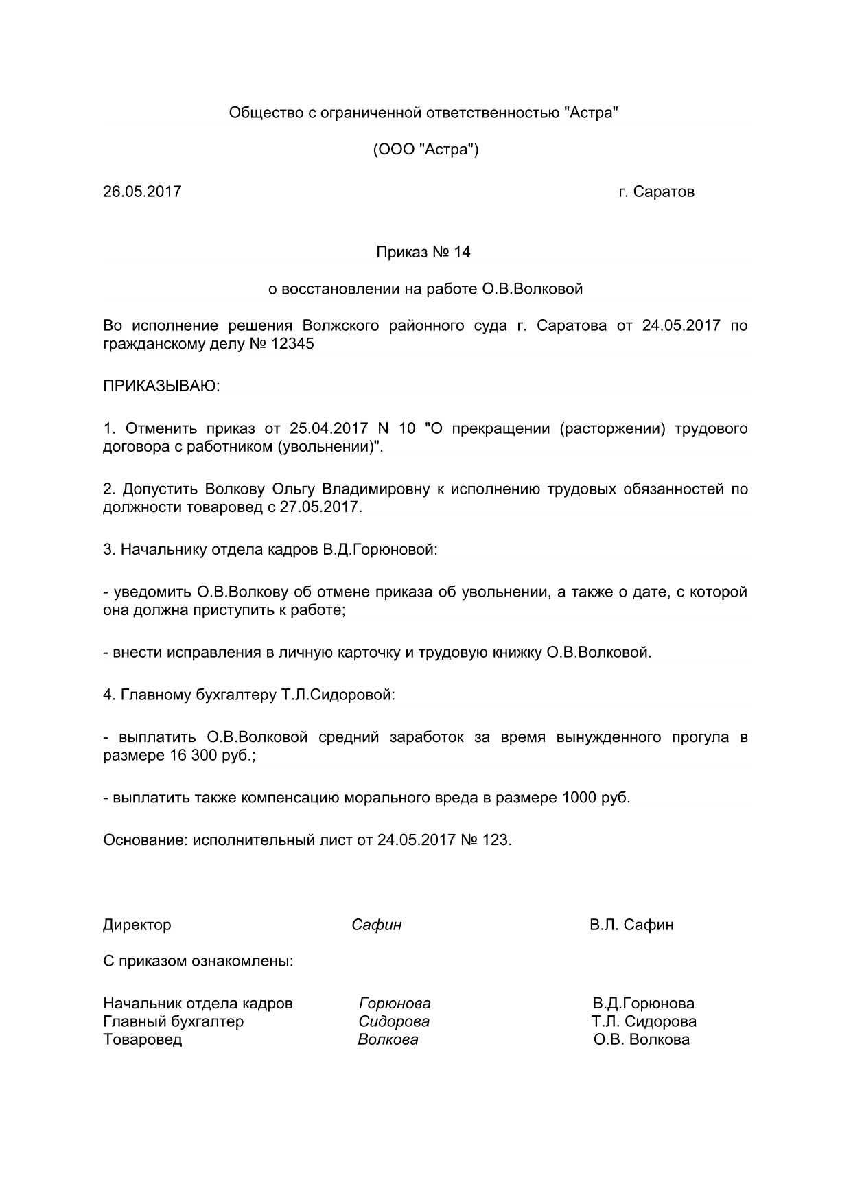 - Сразу же после получения исполнительного листа отменить приказ о расторжении трудового договора и издать новый – о том, что истец может продолжать работу.