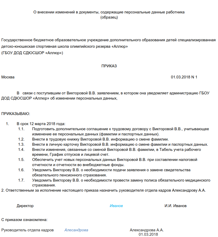Иногда информация о сотруднике меняется (например, в связи с замужеством происходит смена фамилии). В таком случае сотрудник направляет работодателю заявление, на основании которого последний издает приказ о внесении изменений в ряд документов.