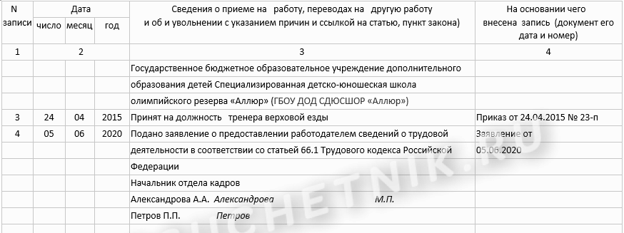 Директору ГБОУ ДОД СДЮСШОР «АЛЛЮР» Иванову Ивану Ивановичу От преподаватель верховой езды Петрова Петра Петровича ЗАЯВЛЕНИЕ В связи с переходом на электронные трудовые книжки и в соответствии со ст. 66 и 66.1 ТК РФ прошу выдать мне трудовую книжку на руки и предоставлять в дальнейшем сведения о моей профессиональной деятельности только в соответствии со ст. 66.1 ТК РФ.