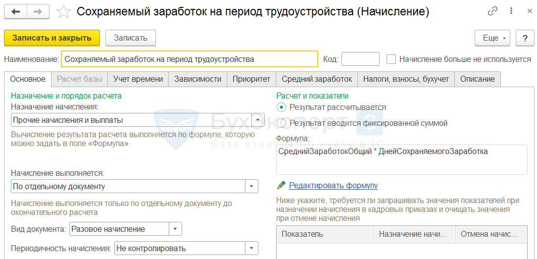 Настроим новое Начисление. Назначение начисления выберем Прочие начисления и выплаты, способ выполнения – По отдельному документу, формулу пропишем СреднийЗаработокОбщий * ДнейСохраняемогоЗаработка.